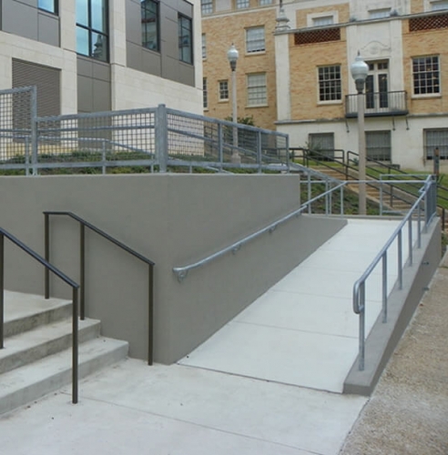 Rampas: lados mínimos 1.10 m, longitud de tramo máxima 6 m; descanso con un radio de 1.50 m, doble pasamanos de ambos lados (altura 0.75 m y 0.90 m); cálculo de la pendiente para rampas interiores y exteriores, zócalo de prevención 0.10 m, solado de prevención en el comienzo y final del tramo de la rampa, solado antideslizante.